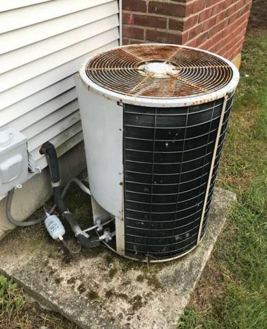 Our team replaced this outdated R22 AC system with a new Carrier R410A system.
